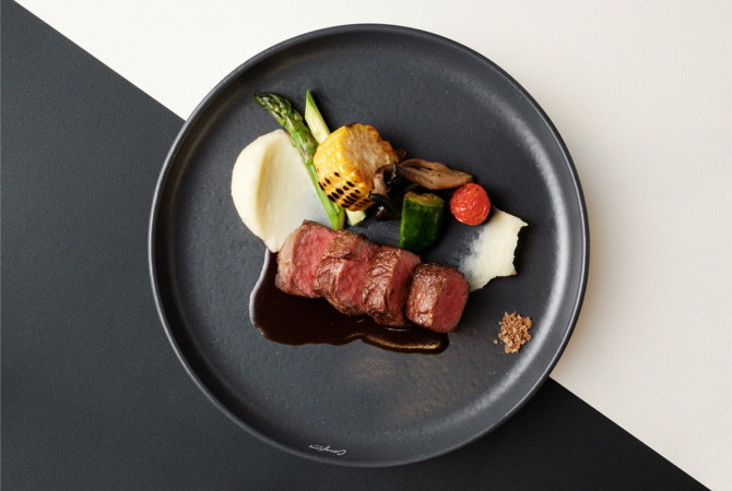 크림치즈 샐러드는 부드러운 크림치즈와 함께 신선한 채소·과일로 입맛을 돋우며, 채끝 스테이크는 72시간 드라이 에이징해 부드러운 식감과 깊은 풍미를 느낄 수 있다. 추가 비용 부담을 통해 마블링 최고 등급(No.9)의 경주천년한우 안심 스테이크로 변경 가능하다.