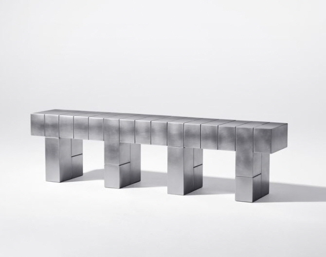 김정섭 작가의 대표작 'Compositional Steel Bench, Low Table (2022)'은 반복과 조화를 강조하는 기하학적인 형상의 작품으로 금속 특유의 색감과 질감을 강조하며, 대상의 본질에 대해 관람객 스스로 생각하게 만든다.