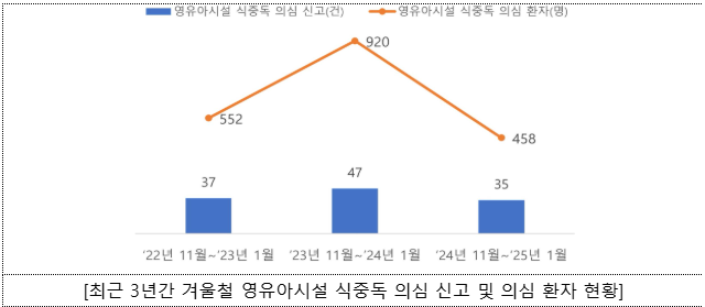 한편 2024년 11월부터 2025년 1월까지 어린이집‧유치원에서 식중독 발생 신고 건수 및 의심 환자 수는 그간 신고 사례에 비해 감소한 수준이나, 밀집된 공간에서 단체생활로 인한 사람 간 직·간접적인 접촉에 지속적으로 주의가 필요하다.