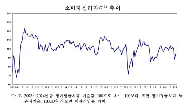 CCSI는 지난해 7~11월까지 100 이상을 기록했다가 지난해 12월 계엄 사태 여파로 88.2로 급락했다. 이후 정치적 상황이 안정될 것이라는 기대감에 1월 91.2로 회복한 뒤 상승세를 이어가고 있다.