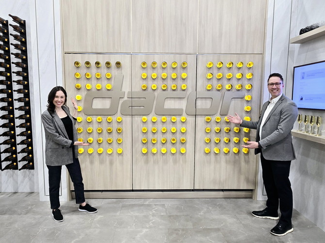 삼성전자 직원이 KBIS 2025에서 럭셔리 빌트인 주방가전 브랜드 데이코 부스에서 와인병으로 꾸며진 이색 포토월을 소개하고 있다. ⓒ 삼성전자