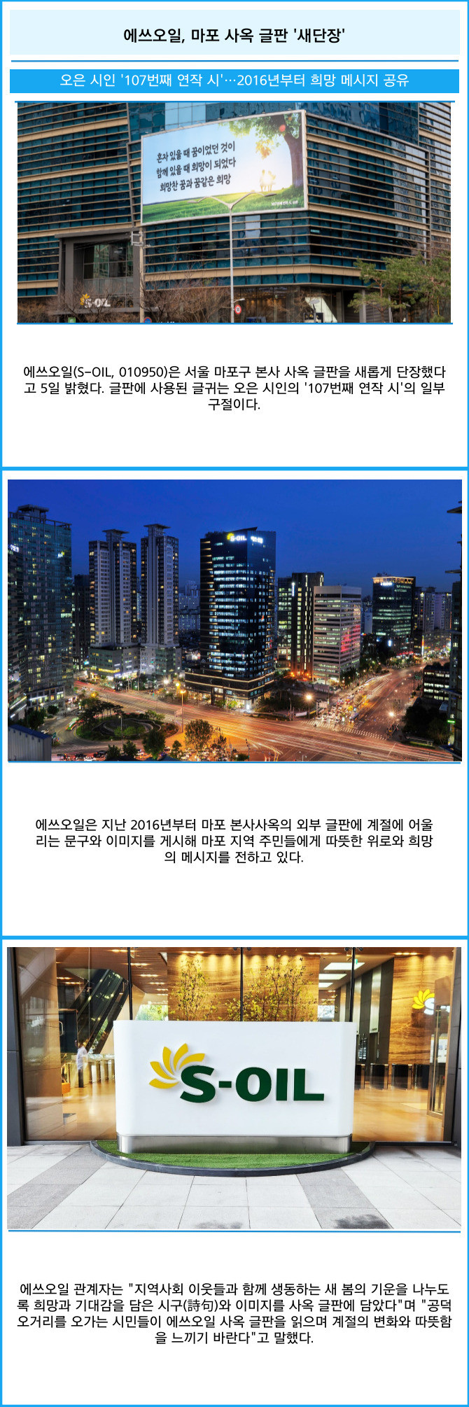 [프라임경제] 에쓰오일(S-OIL, 010950)은 서울 마포구 본사 사옥 글판을 새롭게 단장했다고 5일 밝혔다. 글판에 사용된 글귀는 오은 시인의 '107번째 연작 시'의 일부 구절이다.