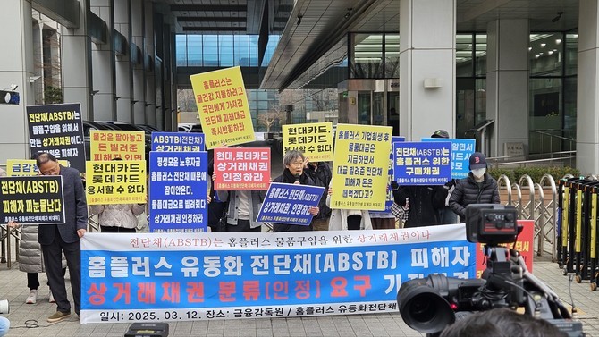 홈플러스 유동화 전단채 비상대책위원회(대책위)는 지난 12일 오전 서울 여의도 금융감독원 앞에서 유동화 전단채가 우선 변제될 수 있도록 상거래 채권으로 인정해야 한다고 촉구하는 집회를 열었다. 홈플러스 유동화 전단채 피해자들의 첫 집단행동으로 이날은 약 20명이 모였다.