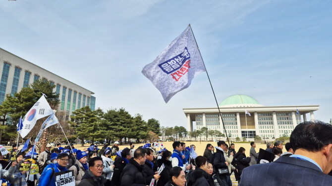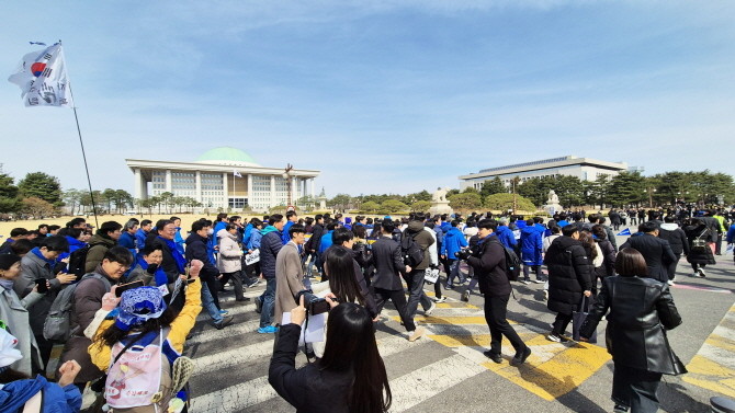[프라임경제] 박찬대 더불어민주당 원내대표를 비롯한 민주당 의원들이 17일 서울 여의도 국회에서 광화문 방향으로 윤석열 대통령 파면을 촉구하는 도보행진을 진행하고 있다.