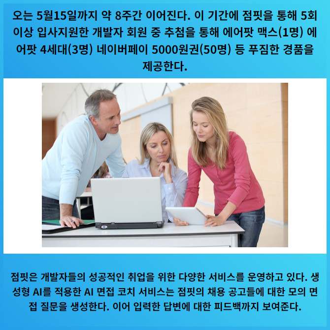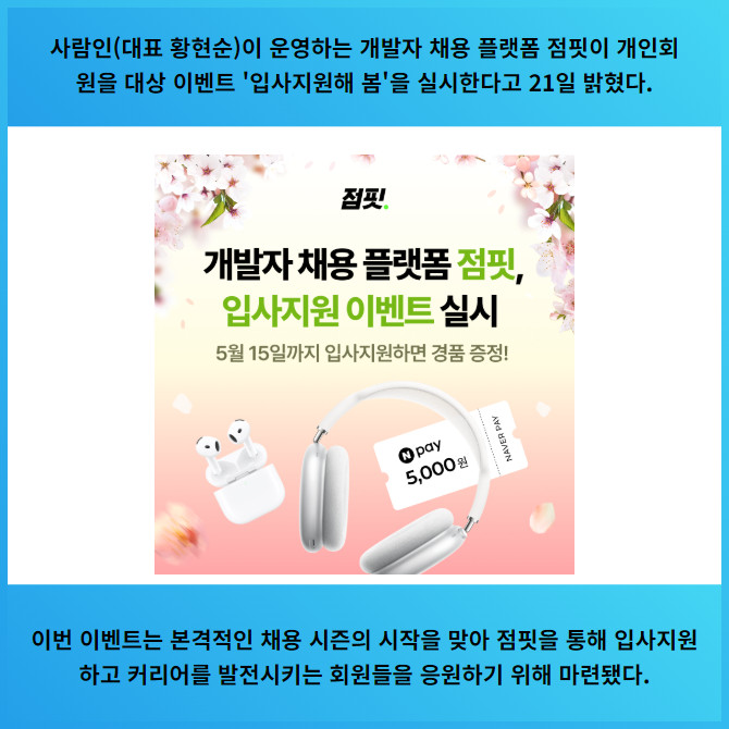 [프라임경제] 사람인(대표 황현순)이 운영하는 개발자 채용 플랫폼 점핏이 개인회원을 대상 이벤트 '입사지원해 봄'을 실시한다고 21일 밝혔다.