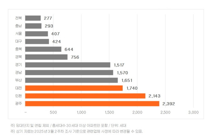 지방의 경우 △광주 2392세대 △대전 1740세대 △부산 1651세대 △경남 1570세대 △경북 756세대 △충북 644세대 △대구 424세대 △충남 293세대 △전북 277세대가 입주한다.