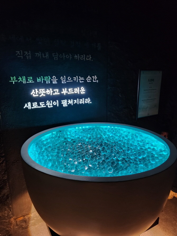 팝업 입구에서 복주머니를 받고 마주한 첫 체험 공간은 새로도원의 전설과 비밀을 확인할 수 있는 '족자봉 방'을 지나면 신비로운 분위기를 자아내는 공간 '도원비'에 들어선다. 이곳에서는 입구에서 받은 복주머니 설탕 구술 3개를 담으면 된다. 구슬은 몸 속에 쌓인 설탕결정을 의미한다. 제로슈거가 되기 위해 속세에 쌓인 설탕 결정(구슬) 3개를 직접 꺼내 담는 것이다.