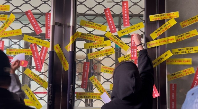 홈플러스 물품구매 전단채 피해자들이 홈플러스 본사 정문에 종이를 붙이며 항의하고 있다. = 배예진 기자