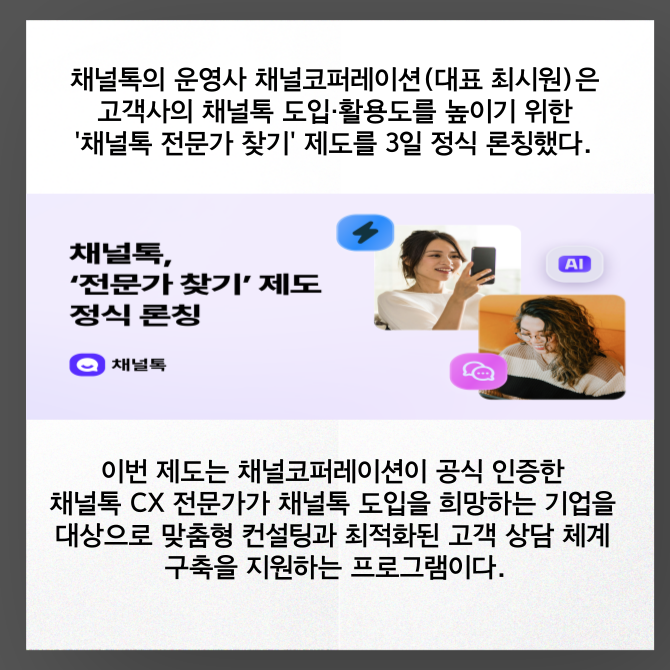 [프라임경제] 채널코퍼레이션(대표 최시원)이 고객사의 채널톡 도입·활용도를 높이기 위한 '채널톡 전문가 찾기' 제도를 3일 정식 론칭했다.