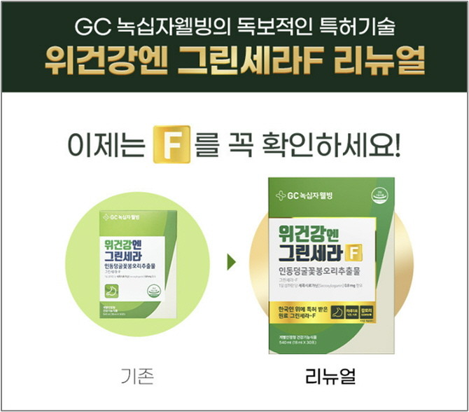 한편 '위건강엔 그린세라F'는 GC녹십자웰빙이 10년간의 연구 끝에 개발한 위 건강 기능성 제품으로, 2019년 식품의약품안전처로부터 기능성을 인정받은 개별인정형 원료 '그린세라-F(인동덩굴꽃봉오리추출물)'를 함유하고 있다.