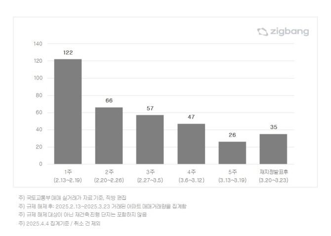 이에 직방은 거래허가구역 해제 직후(2월13일)부터 재지정 직전(3월23일)까지 대상지역 거래 데이터를 살펴봤다.