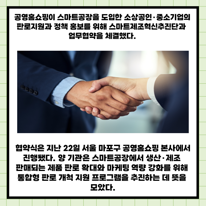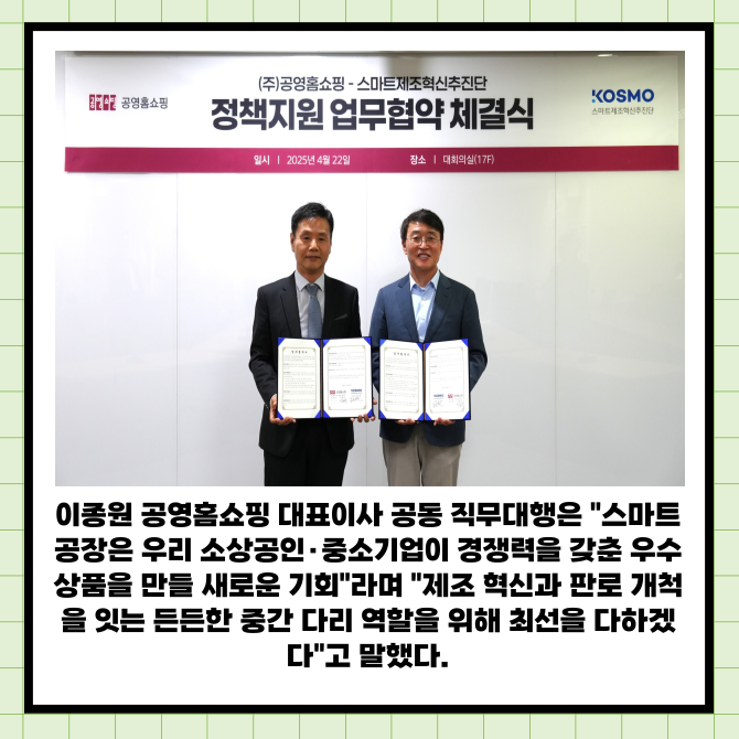 [프라임경제] 공영홈쇼핑이 스마트공장을 도입한 소상공인·중소기업의 판로지원과 정책 홍보를 위해 스마트제조혁신추진단과 업무협약을 체결했다.