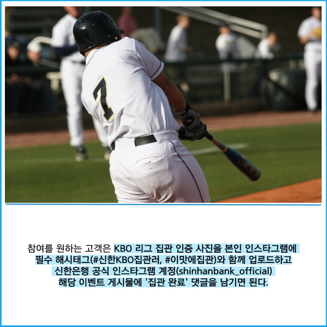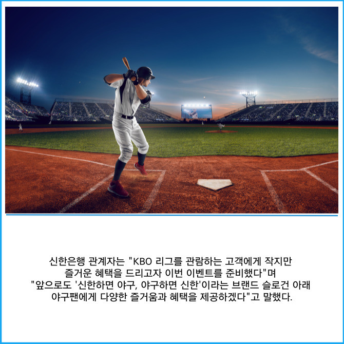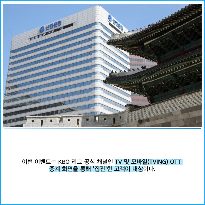 [프라임경제] 신한은행은 내달 9일까지 2025 신한 SOL Bank KBO 리그 '집관(집에서 관람) SNS 인증' 이벤트를 진행한다고 28일 밝혔다.