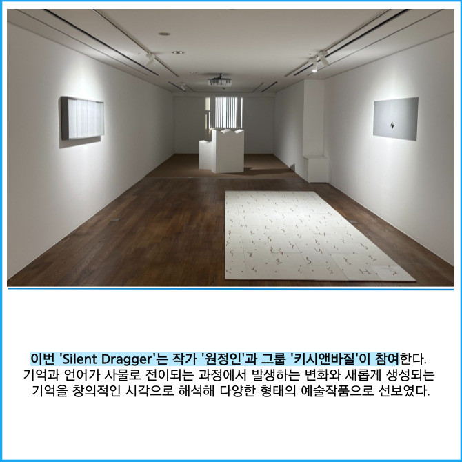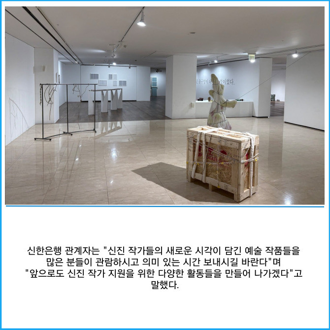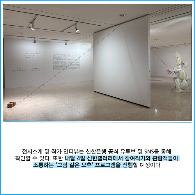 [프라임경제] 신한은행은 오는 7월10일까지 서울시 역삼동 소재 신한갤러리에서 신진작가 육성 프로그램인 '2025 신한 영 아티스트 페스타'의 두 번째 기획전시 'Silent Dragger(조용히 끄는 사람)'를 개최한다고 29일 밝혔다.