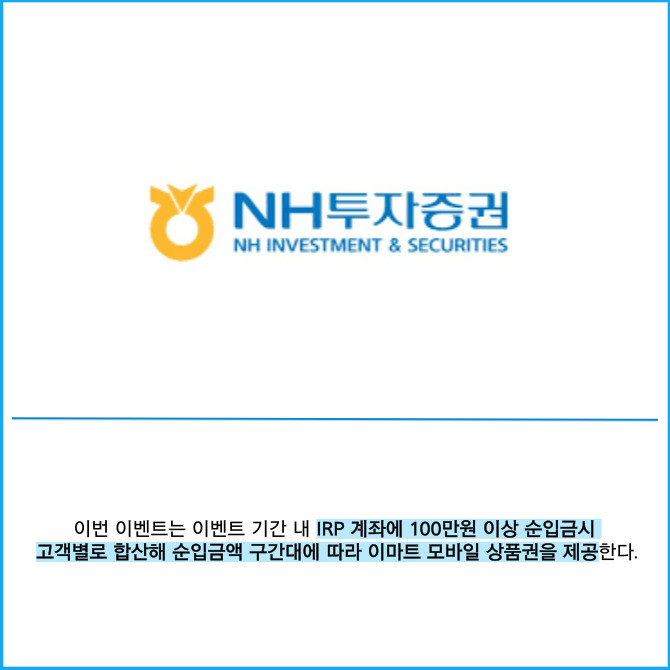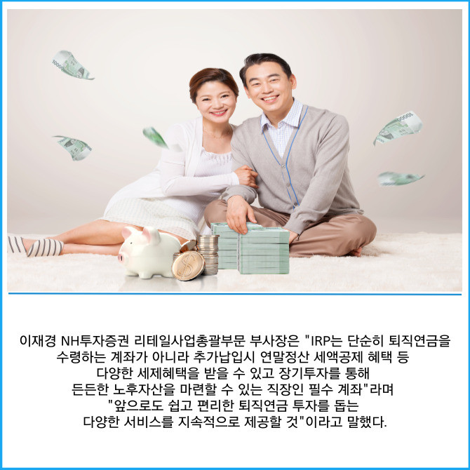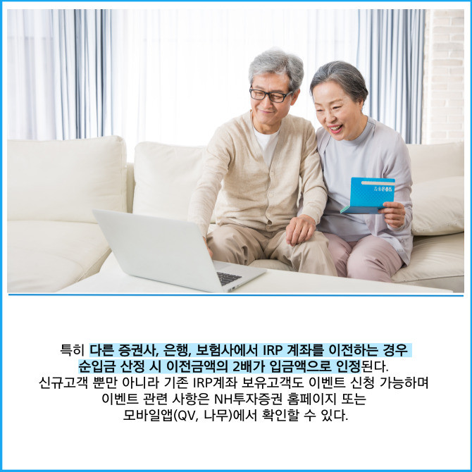 [프라임경제] NH투자증권(005940)은 '퇴직연금 개인형퇴직연금(IRP) 입금 이벤트'를 오는 10월31일까지 진행한다고 5일 밝혔다.
