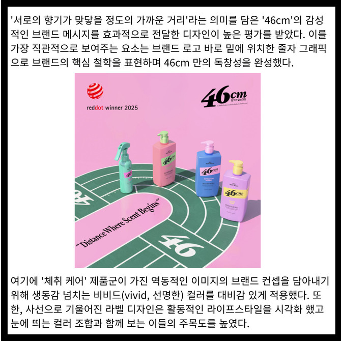 [프라임경제] LG생활건강의 체취 케어 전문 브랜드 '46cm'가 세계 최고 권위의 '2025 레드닷 디자인 어워드(Red Dot Design Award)'에서 본상을 수상했다.