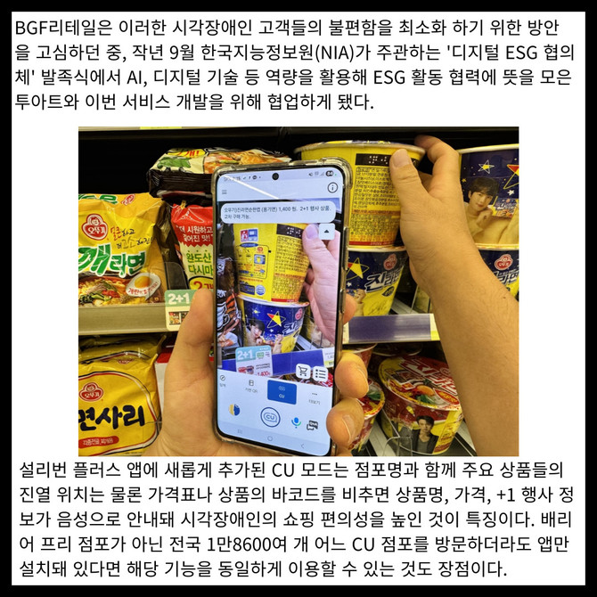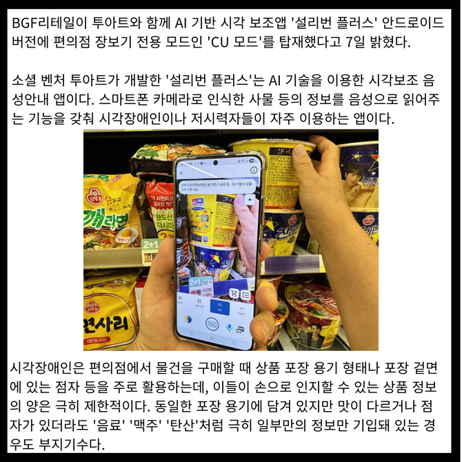시각 보조 앱 '설리번 플러스'에 CU모드 개발...음성으로 정보 안내