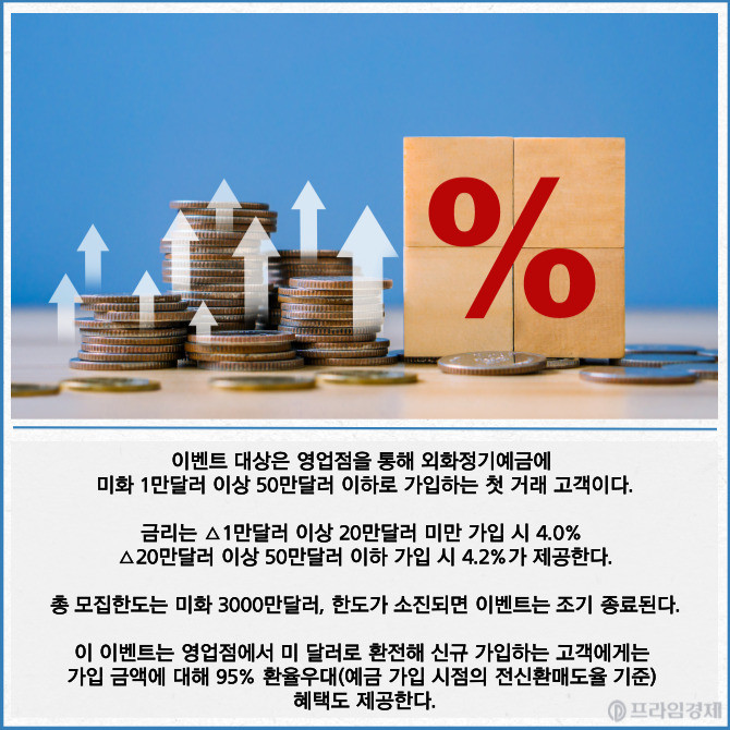 [프라임경제] SC제일은행이 미 달러화 정기예금(3·6개월제) 가입 고객에게 최고 4.2%(이하 연, 세전) 특별금리를 제공하는 이벤트를 오는 29일까지 실시한다고 11일 밝혔다.