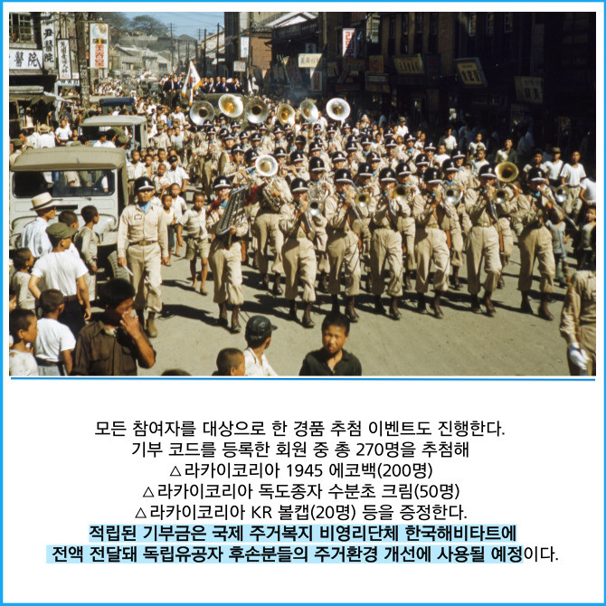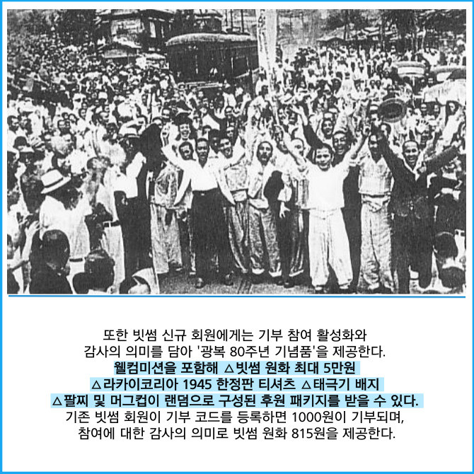 [프라임경제] 빗썸이 광복 80주년을 맞아 역사의 의미를 되새기고 사회적 책임을 실천하는 기부 캠페인을 진행한다고 13일 밝혔다. 이번 캠페인은 빗썸과 사회적 메시지를 전하는 패션 브랜드 라카이코리아가 공동으로 기획했으며 오는 31일까지 운영된다.