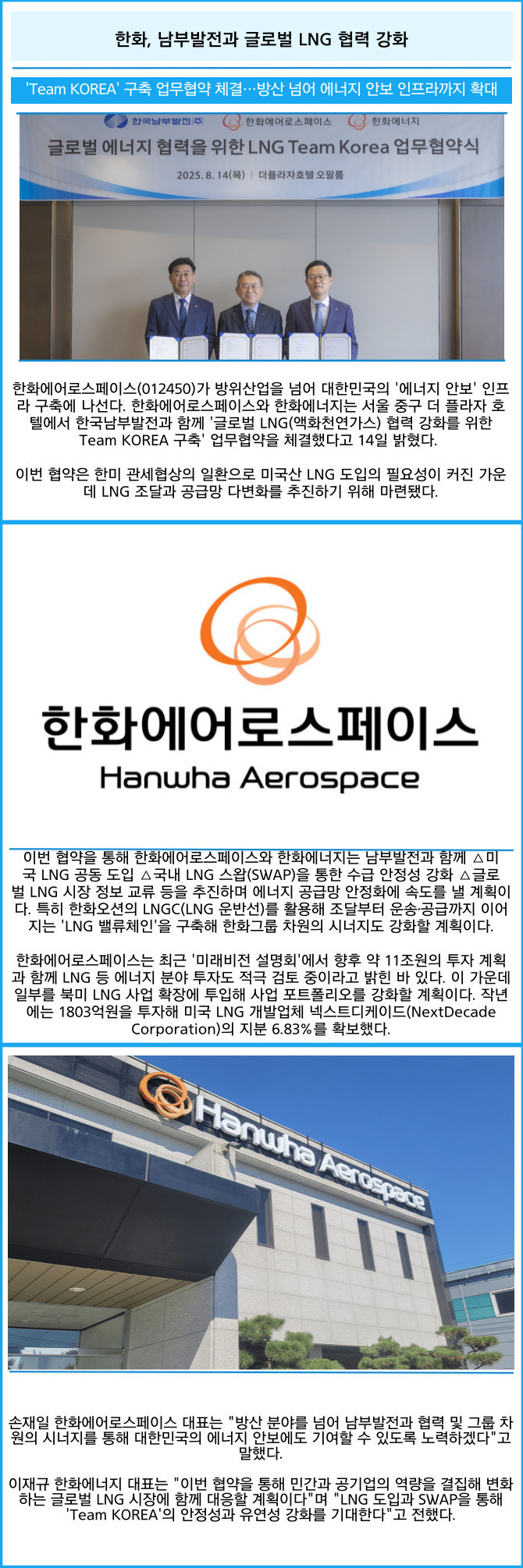 [프라임경제] 한화에어로스페이스(012450)가 방위산업을 넘어 대한민국의 '에너지 안보' 인프라 구축에 나선다. 한화에어로스페이스와 한화에너지는 서울 중구 더 플라자 호텔에서 한국남부발전과 함께 '글로벌 LNG(액화천연가스) 협력 강화를 위한 Team KOREA 구축' 업무협약을 체결했다고 14일 밝혔다.