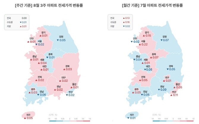 부동산R114에 따르면, 8월 둘째 주 전국 아파트 전세가격 변동률은 0.00%로, 사실상 제자리걸음을 기록했다. 서울(-0.02%)과 수도권(-0.01%) 모두 소폭 하락했으며, 5대 광역시는 0.00%를 나타냈다.