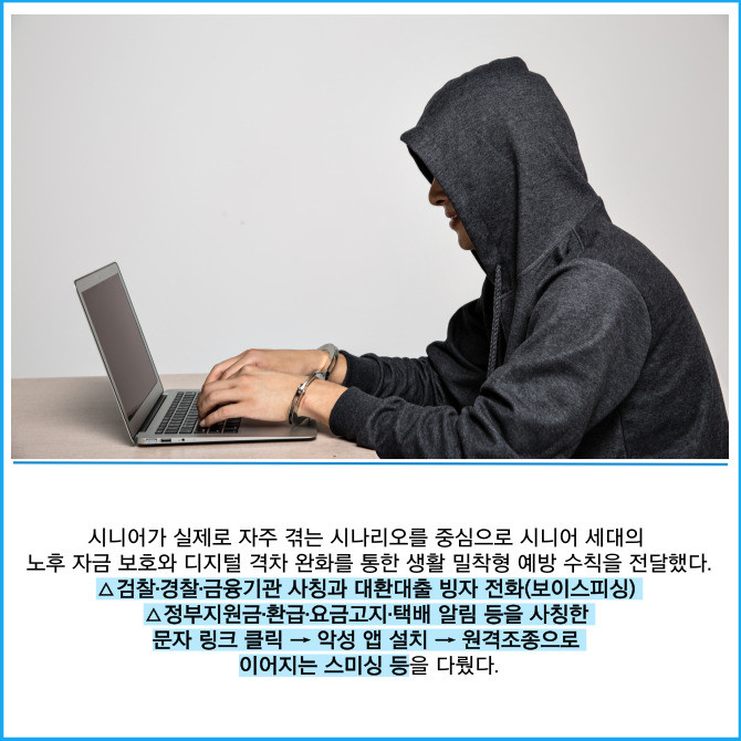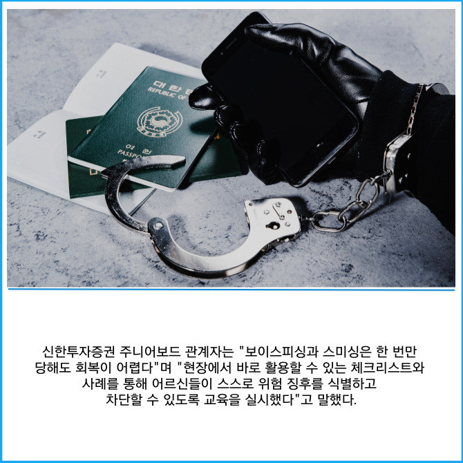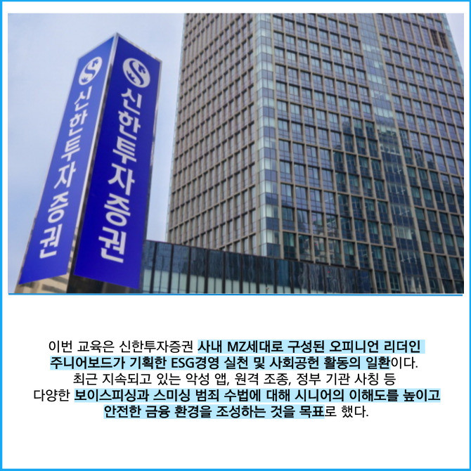 [프라임경제] 신한투자증권 주니어보드는 지난 14일 마포 종합노인복지관에서 금융사기에 취약한 시니어를 대상으로 '보이스피싱·스미싱(SMS 사기) 예방 교육'을 진행했다고 18일 밝혔다.