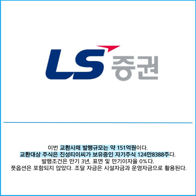 [프라임경제] LS증권(078020)은 건설중장비 부품기업 진성티이씨(036890)의 보유 자사주를 활용한 교환사채(EB) 발행을 27일 완료할 예정이라고 밝혔다.