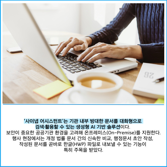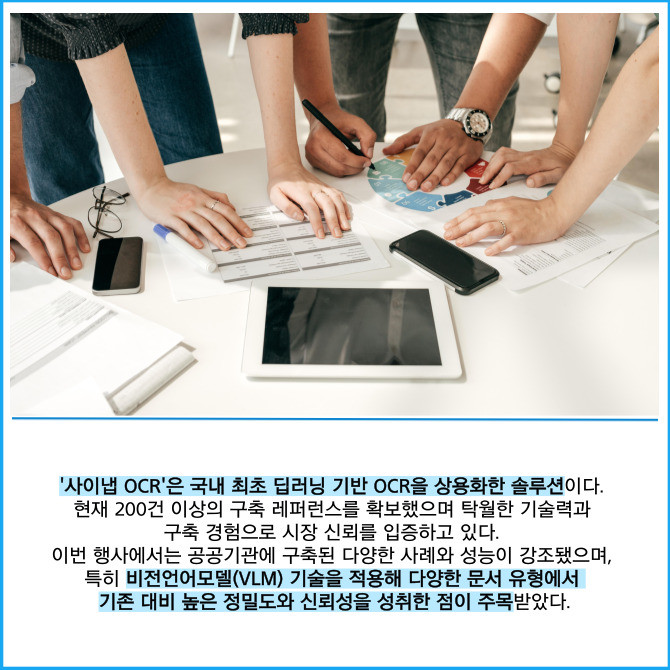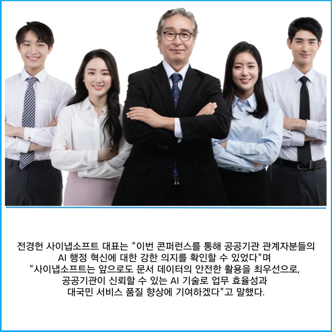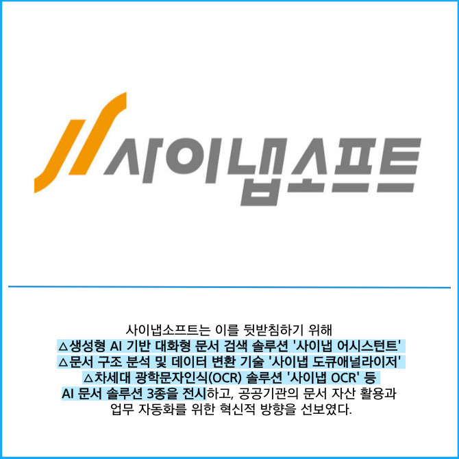 [프라임경제] 인공지능(AI) 전문 기업 사이냅소프트(466410)는 지난 27일 정부세종컨벤션센터에서 열린 '제7회 AI정부 혁신 콘퍼런스'에 참가해 공공기관의 AI 활용이 단순 데이터 추출과 질의응답을 넘어, 문서 작성과 실질적 활용 영역까지 확대되는 AI 기술 흐름에 맞춰 이에 특화된 문서 AI 전략을 제시했다고 28일 밝혔다.