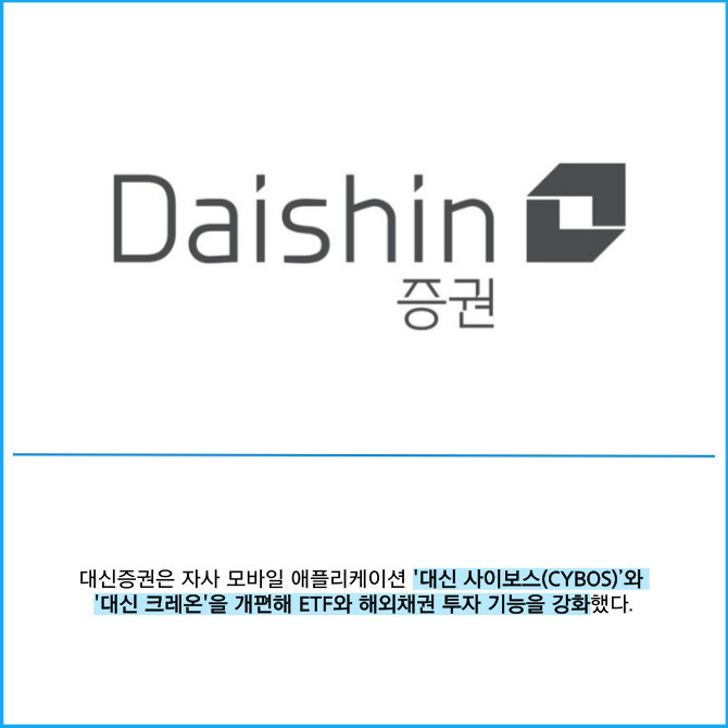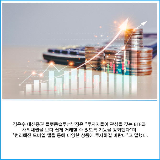 [프라임경제] 대신증권(003540)은 상장지수펀드(ETF)와 해외채권 투자 수요 확대에 맞춰 모바일 앱을 개편했다고 1일 밝혔다.