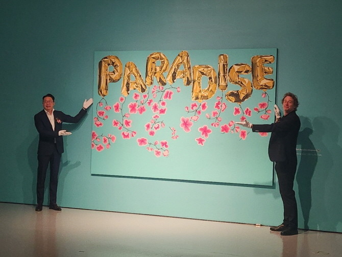 조엘 메슬러와 최종환 파라다이스시티 대표가 조엘 메슬러의 대표작인 'Paradise with Blossom' 작품을 설명하고 있다. = 추민선 기자
