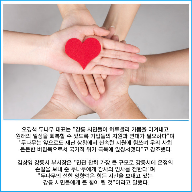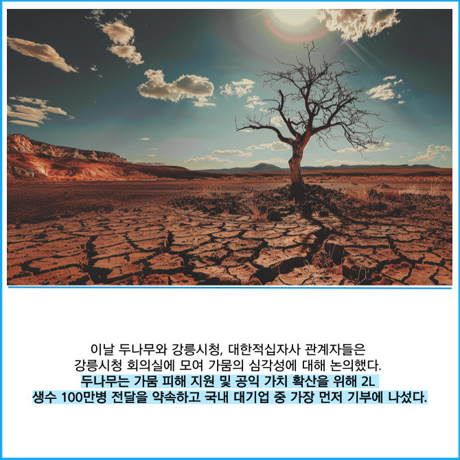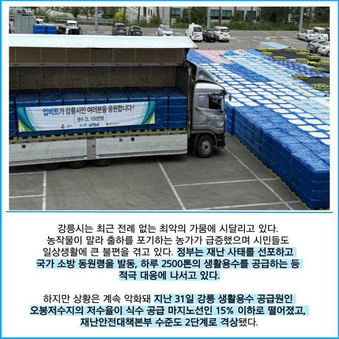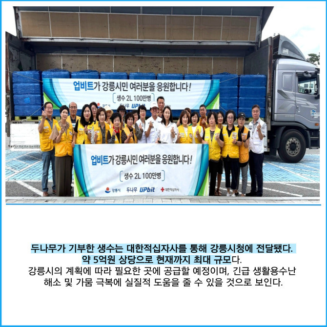 [프라임경제] 가상자산 거래소 업비트 운영사 두나무는 극심한 가뭄으로 어려움을 겪고 있는 강릉시에 생수 100만병을 기부했다고 1일 밝혔다.