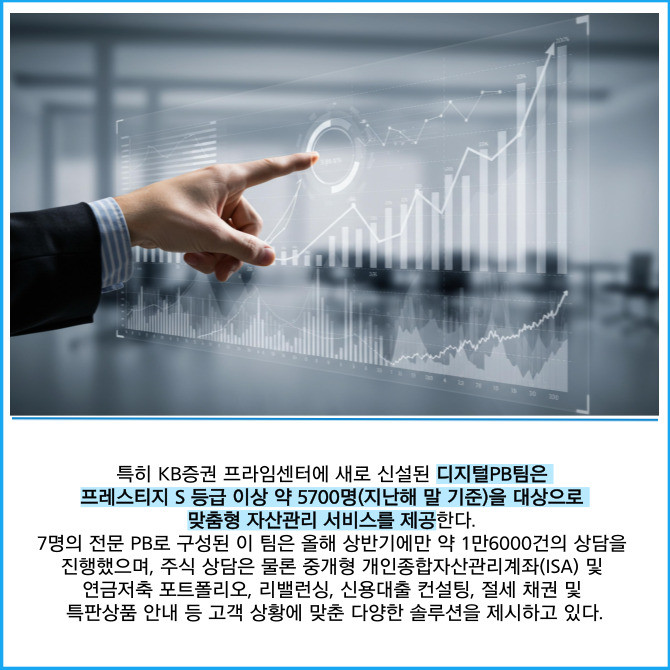 [프라임경제] KB증권은 디지털 금융 확산에 맞춰 올해 초 프라임(Prime)센터 내 '디지털 프라이빗뱅커(PB)팀'을 신설, 디지털 우수고객을 위한 차별화된 자산관리 서비스를 강화했다고 5일 밝혔다.