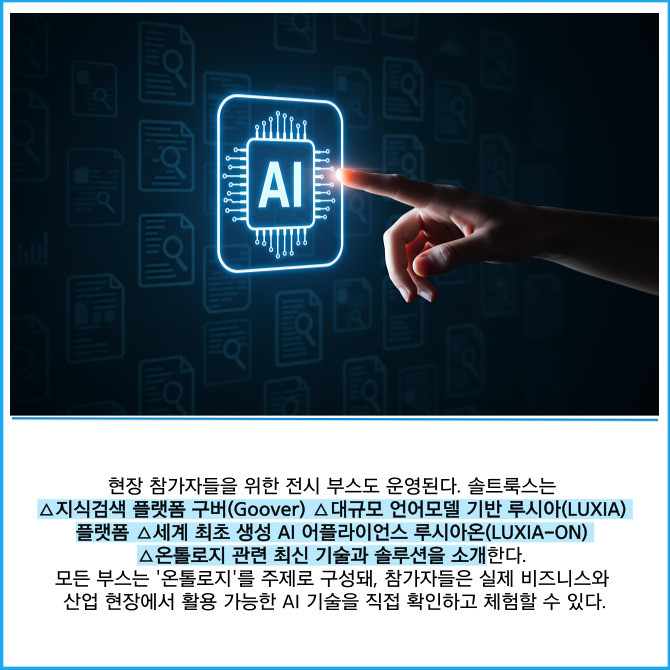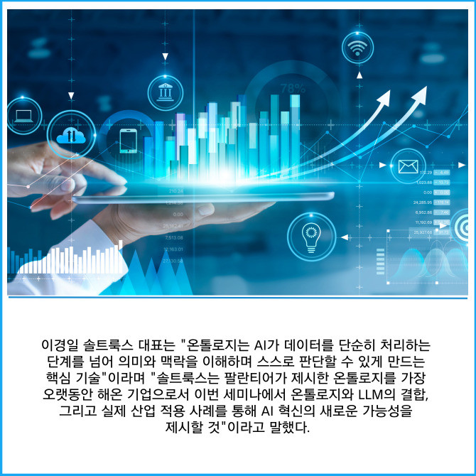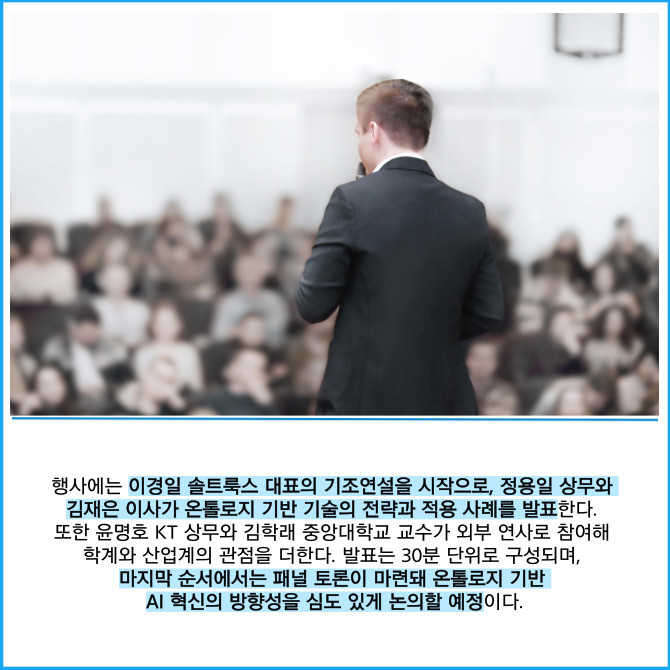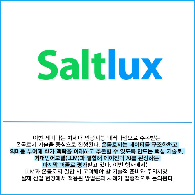[프라임경제] 인공지능(AI) 전문기업 솔트룩스(304100)는 내달 1일 서울 강남구 한국과학기술회관 국제회의실에서 '에이전틱 AI의 마지막 퍼즐, 온톨로지(Ontology)' 세미나를 개최한다고 16일 밝혔다.