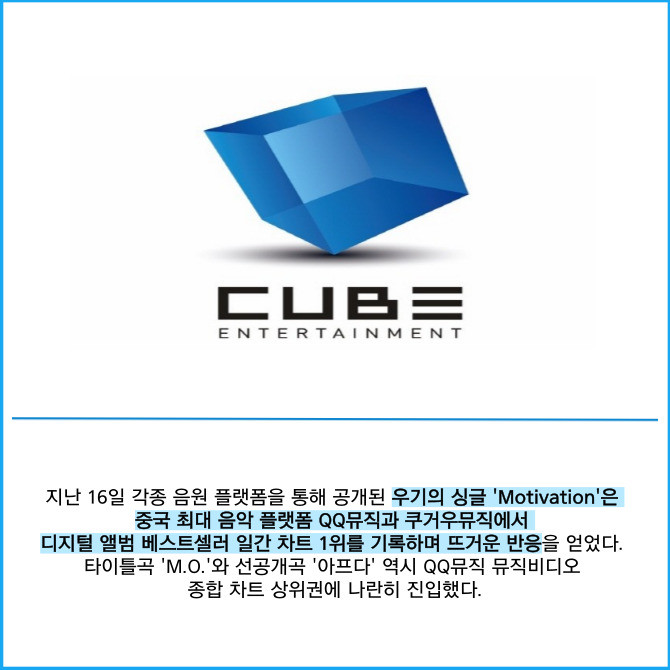 [카드] 큐브엔터, 'i-dle 우기' 첫 싱글로 韓中 음악차트 1위 행진