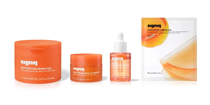 시그닉 플럼핑 펩타이드 라인은 △피부 탄력을 빠르게 케어해 주는 '바운스 업 크림' △주름과 탄력을 한 번에 관리해 주는 '더블 이펙트 세럼' △모공 속 노폐물을 케어해 매끈한 피부 결을 완성해 주는 '포어 리뉴 패드' △눈가·팔자·이중턱 라인 등 피부의 윤곽을 잡아주는 '인스턴트 플럼핑 마스크' 등 총 4가지 제품으로 구성됐다.