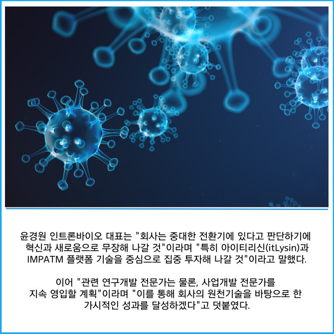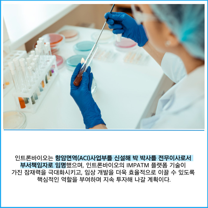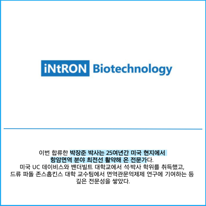 [프라임경제] 박테리오파지 전문 신약개발사인 인트론바이오(048530)는 항암면역 분야 세계적 권위자인 드류 파돌 존스홉킨스 의과대학교수 연구팀 출신인 박장준 박사를 영입하고, 지능형 모듈형 파지 조립(IMPATM) 플랫폼 기술의 항암면역 분야 개발 및 상용화 경쟁력을 한층 강화한다고 23일 밝혔다.