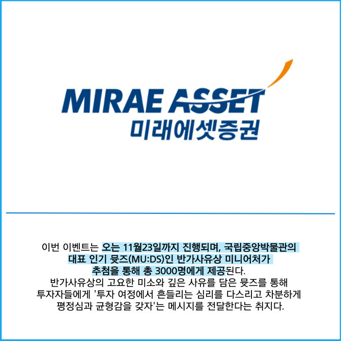 [프라임경제] 미래에셋증권(006800)은 국립박물관문화재단과 협업해 '시장의 파도에도 마음은 평온하게' 이벤트를 실시한다고 23일 밝혔다.