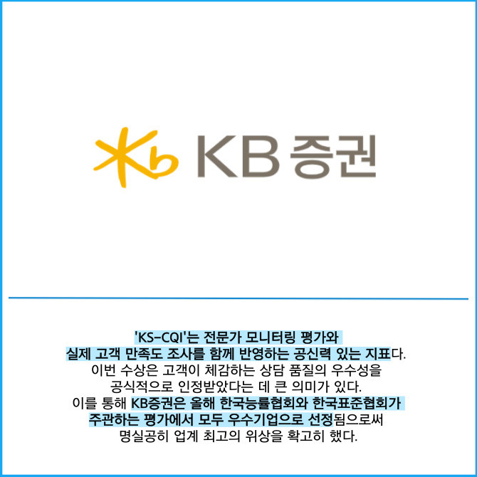 [프라임경제] KB증권은 자사 고객센터가 한국표준협회가 발표한 '2025 콜센터품질지수(KS-CQI)'에서 4년 연속 우수기업에 선정됐다고 23일 밝혔다.