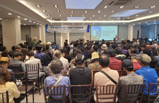 지난 27일 열린 대우마리나1,2차 재건축 사업방식 비교 설명회 모습.=서경수 기자