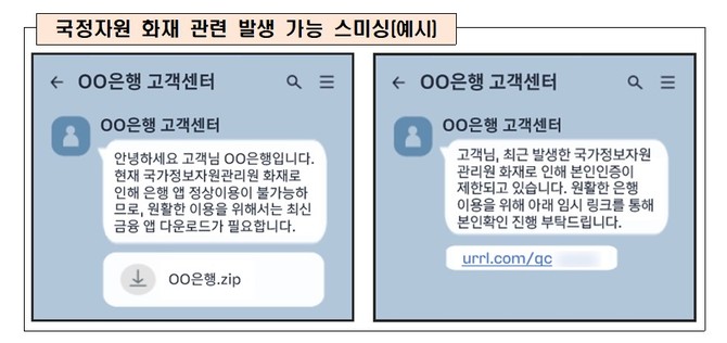 금융당국 관계자는 "국정자원 화재와 관련한 신규 스미싱 시도에 대한 모니터링을 강화하고 피해사례가 다수 발생할 경우 소비자경보를 격상해 신속히 대응할 것"이라고 말했다.