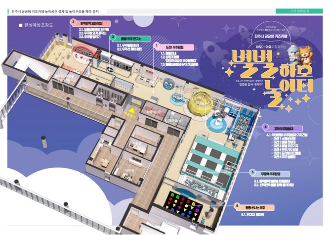 키즈카페 내부는 △영아를 대상으로 촉감놀이를 할 수 있는 감각놀이존 '반짝반짝 꼬마행성' △역할놀이와 우주정비 놀이공간인 상상놀이존 '출발! 우주연구소' △미끄럼틀과 볼풀장에서 신나게 대근육활동을 할 수 있는 탐험놀이존 '꼬마 우주탐험대' △트램펄린과 클라이밍 체험을 할 수 있는 도전놀이 존 '무중력 우주환경' △디지털 신체놀이 체험장인 감성놀이존 '팡팡 신나는 우주'로 연령별 신체발달에 맞춘 놀이공간으로 구성한다.