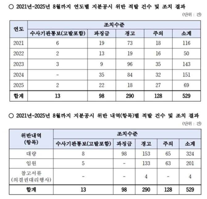 반면 △'과징금' 98건(18.5%) △'수사기관 통보(고발 포함)' 13건(2.5%)에 불과했다. 특히 중징계에 해당하는 수사기관 통보 13건 중 8건은 대량보유 보고 위반에서 발생했고, 과징금 부과 역시 모두 대량보유 보고 위반(98건·100%)에서 발생했다.