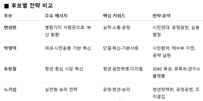 '실력·소통·공정'을 3대 비전으로 내세운 변 위원장은 △당원 주권 확대 △부산탈환시민연대 구성 △공정한 공천관리 등을 제시했다. 지역 정치권에선 '이재명 정부와의 정합성을 높이면서도 행정 경험으로 중심을 잡는 실용 리더'라는 평가가 뒤따른다.