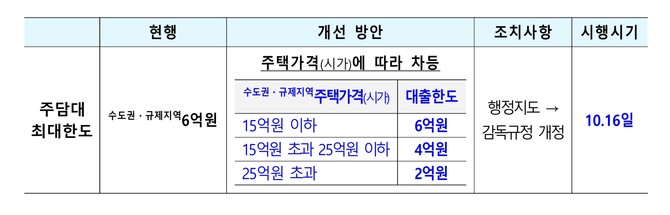 현재 6억원으로 일괄 적용되는 주택담보대출 한도를 주택가격별로 세분화해 △15억원 이하 주택 6억원 △15억 초과 25억원 미만 4억원 △25억원 초과 2억원으로 조정한다.