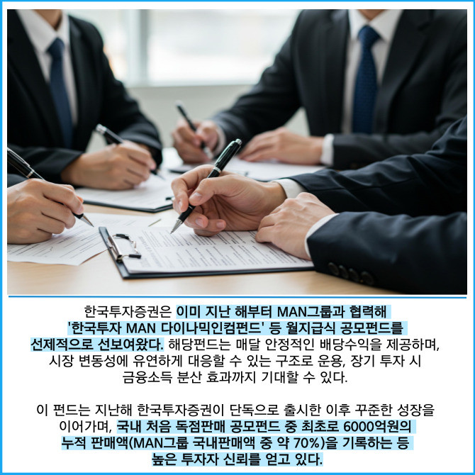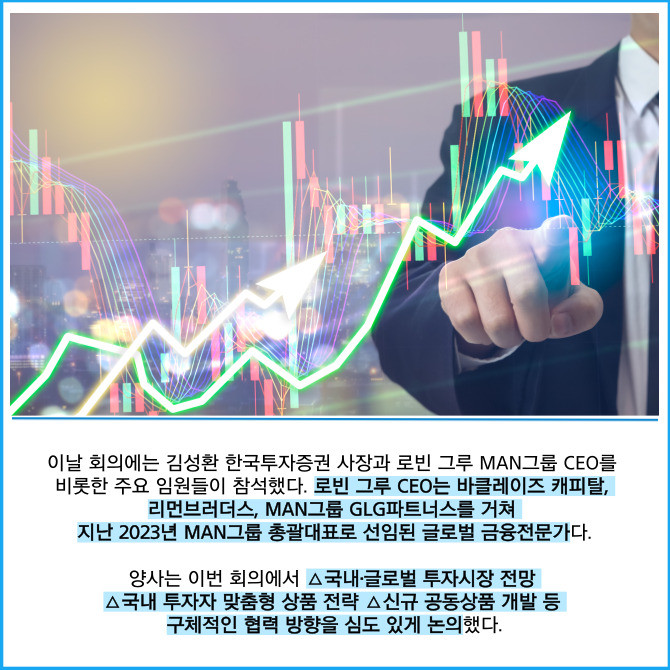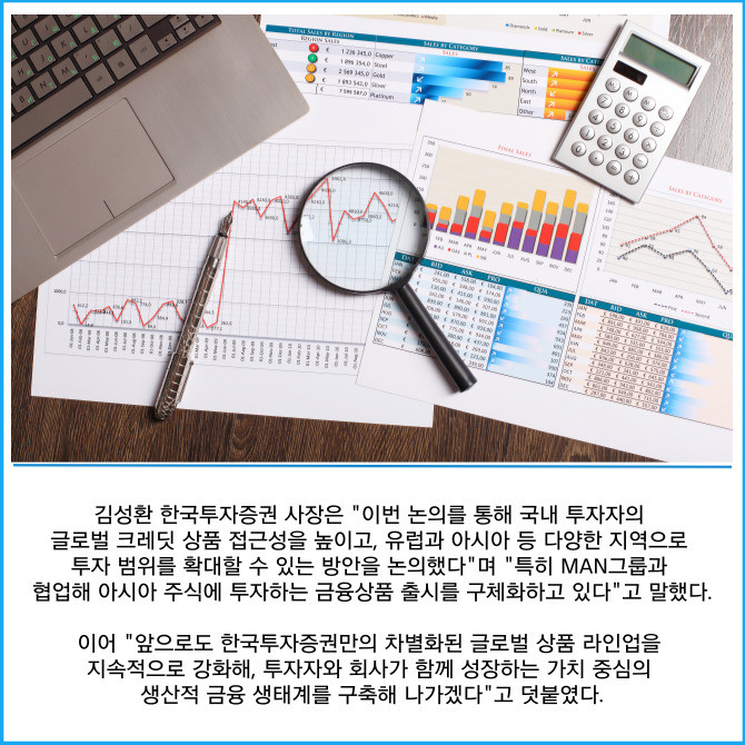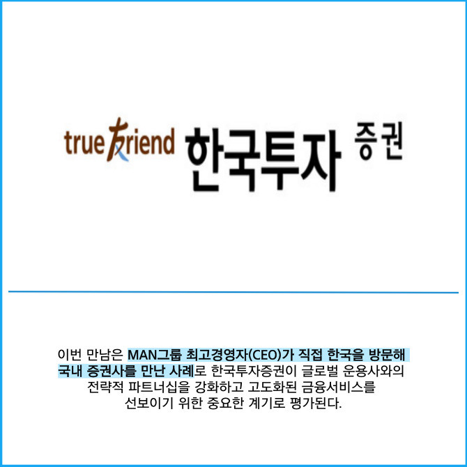 [프라임경제] 한국금융지주(071050) 자회사 한국투자증권은 글로벌 자산운용사 만(MAN)그룹과 만나 국내 글로벌 금융상품 공급 확대 및 향후 협업 방향에 대해 논의했다고 15일 밝혔다.