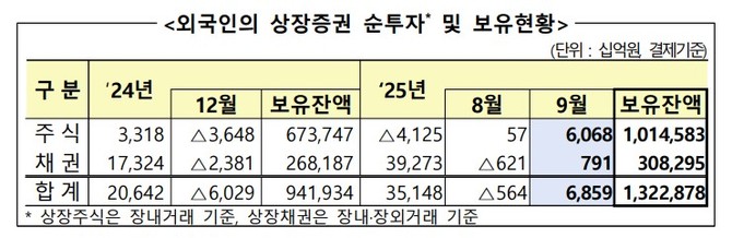 금융감독원(이하 금감원)이 16일 발표한 '2025년 9월 외국인 증권투자 동향'에 따르면 외국인은 지난달 상장주식 6조680억원, 상장채권 7910억원을 순투자했다.
