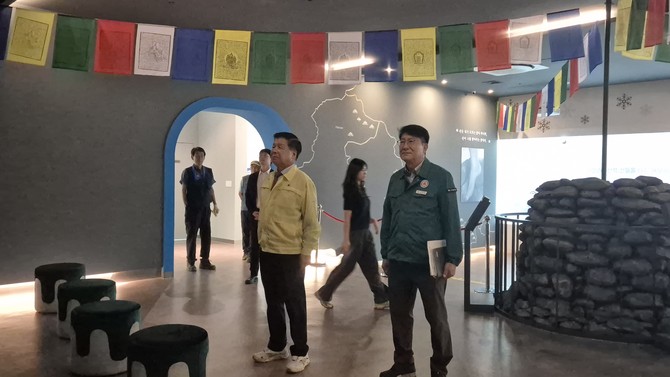 이상근 군수가 갈모봉자연휴양림과 엄홍길전시관을 방문해 주요 사업 추진 현황과 향후 운영 방향을 점검하고, 다가오는 거류산 등산축제와 시설물 안전 관리 사항도 확인하는 모습. ⓒ 고성군