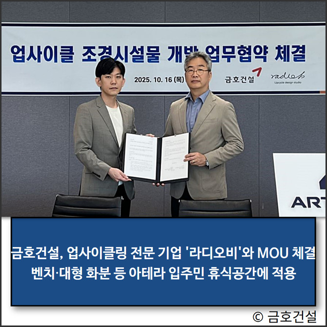 금호건설은 17일 환경 디자인 전문 업체인 '라디오비(RadioB)'와 업사이클링 조경시설물공동개발을 위한 업무협약(MOU)을 체결했다고 밝혔다.
