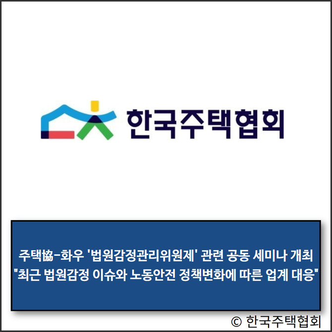 한국주택협회와 법무법인(유한) 화우가 오는 23일 화우 연수원에서 '법원감정 최근 이슈, 노동안전 정부정책대응'을 주제로 공동 세미나를 개최한다.