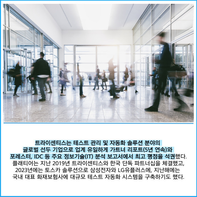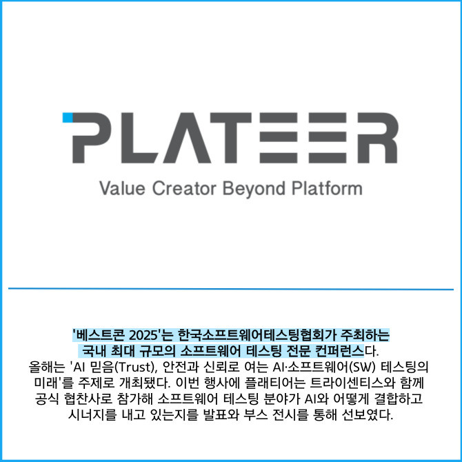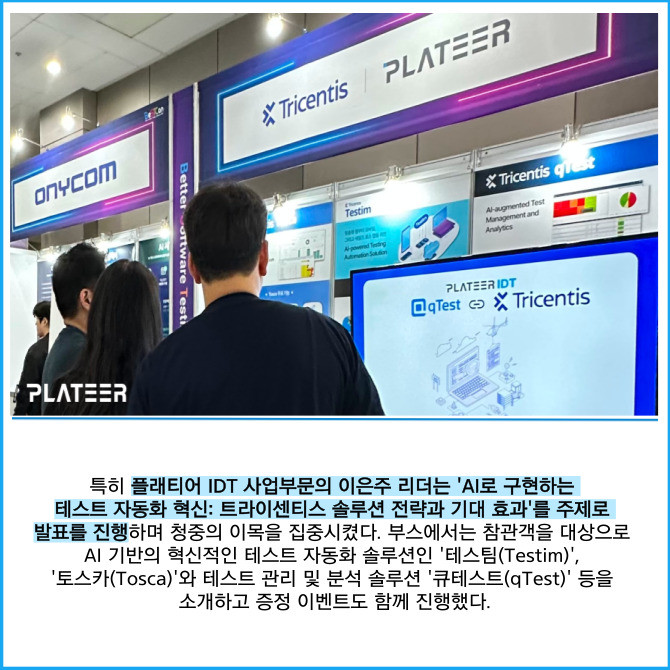 [프라임경제] 인공지능(AI)·디지털전환(DX) 솔루션 전문기업 플래티어(367000)는 지난 21일 서울 삼성동 코엑스에서 개최된 '제11회 국제 품질 테스팅 콘퍼런스(이하 베스트콘 2025)'에 트라이센티스(Tricentis)와 공동으로 참가했다고 22일 밝혔다.